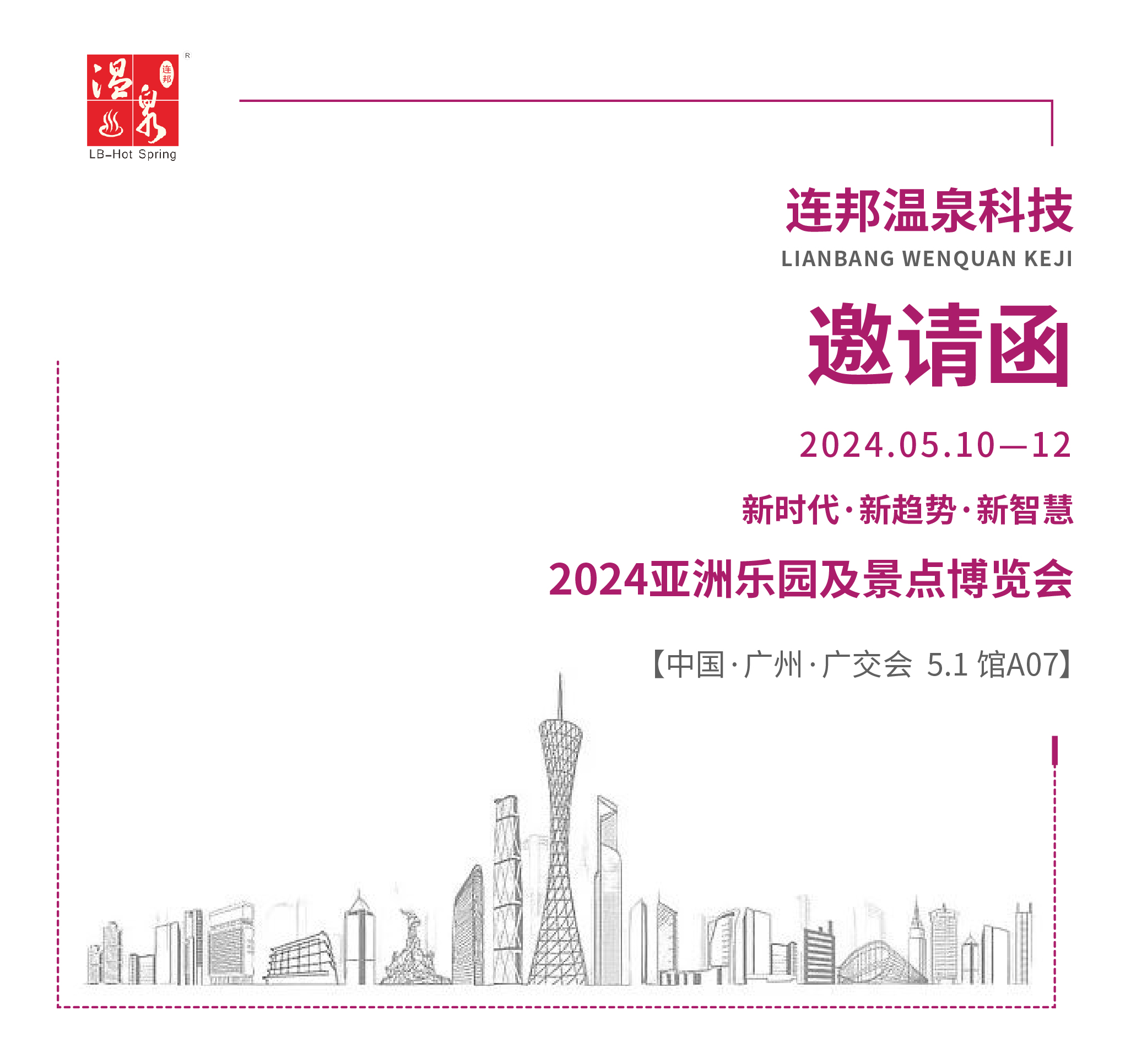 您好!感謝大家長期以來對連邦溫泉科技的大力支持。2024亞洲樂園及景點博覽會將于5月10日-12日盛大開展,連邦溫泉科技真誠的邀請您屆時蒞臨5.1館A07展位參觀指導!