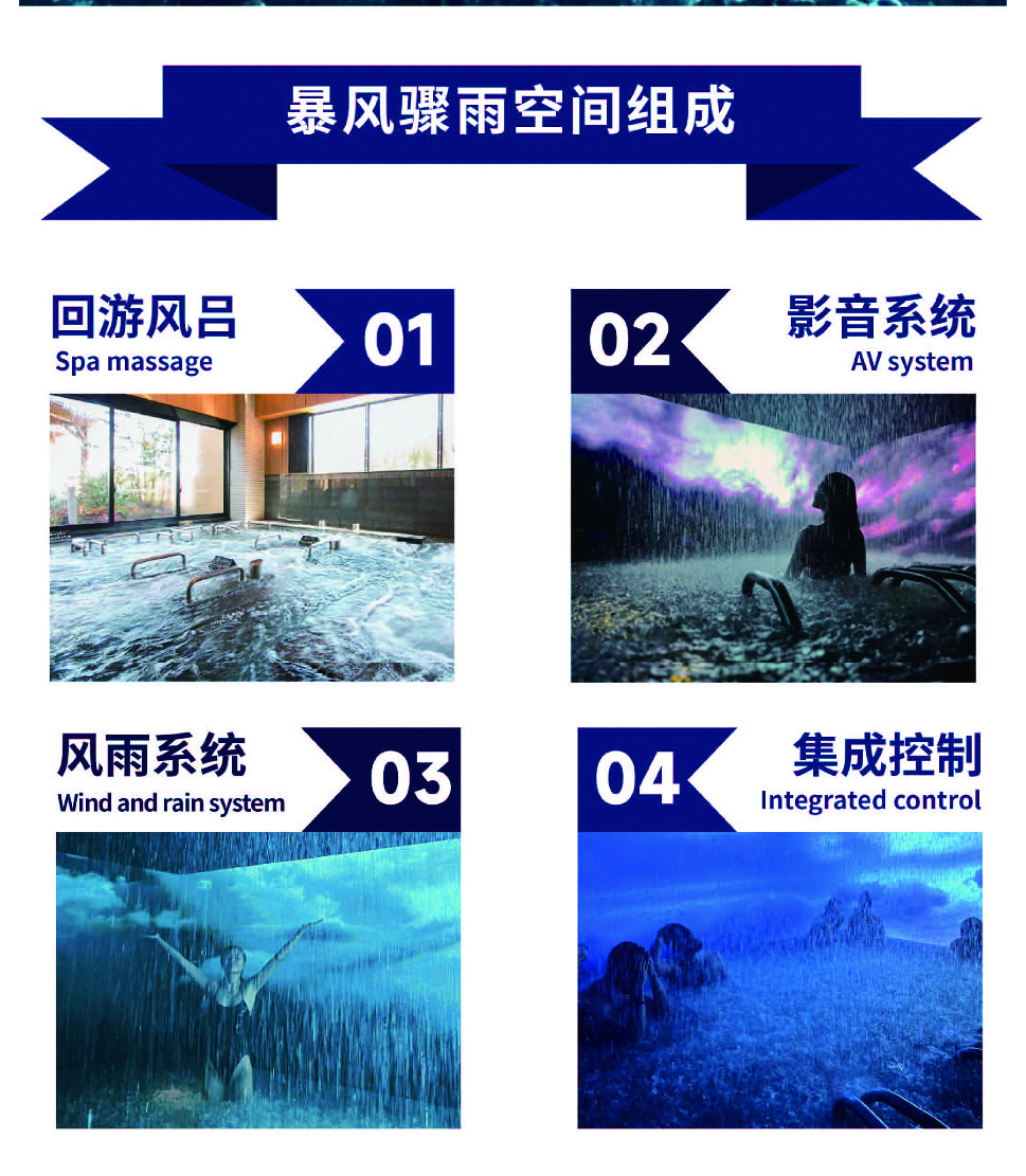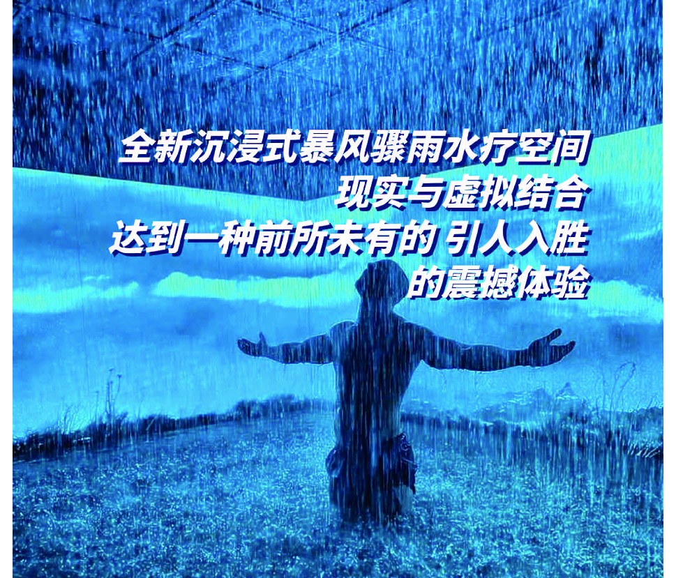 需要齊全的設施構造完美的暴風驟雨主題場景,在空間內部,包括能夠復制模擬暴雨、溫泉水療、雷電、狂風等極端自然天氣現象的設備,以及相應的照明、聲音和視覺影像等特效設備。