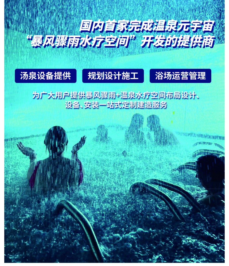 連邦溫泉科技憑借前沿技術,軟硬件自主研制,秉承嚴謹客觀的態度,為廣大用戶提供暴風驟雨+溫泉水療空間布局設計、設備、安裝一站式定制建造服務,為您提供詳細的設備清單與一站式最佳專屬解決方案,助您打造“吸金留客地”,歡迎廣大用戶前來垂詢!